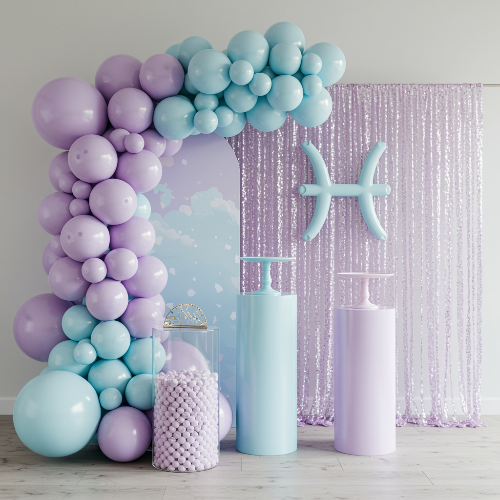 Idea 1: Fiesta Piscis en tonos lila, celeste y plateado iridiscente Una propuesta delicada y soñadora, ideal para quienes buscan una decoración romántica y envolvente. Decoración recomendada