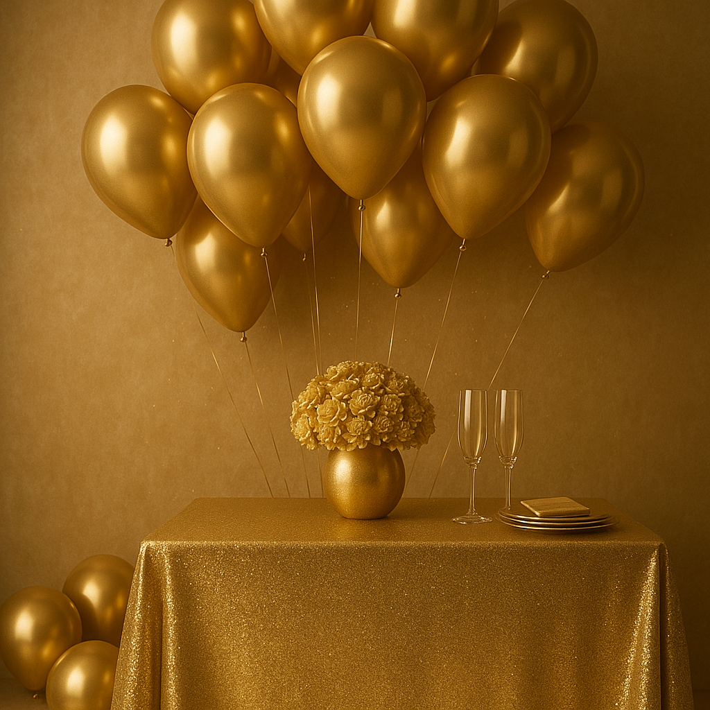 Paletas monocromáticasLas decoraciones de un solo color, como dorado total, rosa pastel total o negro elegante, continúan ganando protagonismo en 2026. Esta tendencia busca crear ambientes visualmente cohesionados que destaquen en fotos y videos. Un mantel dorado combinado con globos metálicos del mismo tono genera un efecto moderno, uniforme y sofisticado, ideal tanto para fiestas íntimas como para grandes celebraciones. | ![]() |