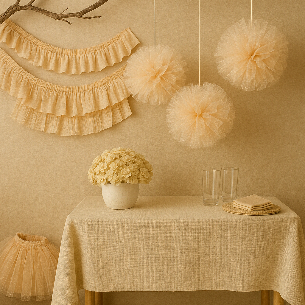 | Texturas naturalesEl papel crepé, el tul, el yute y las telas suaves reemplazan cada vez más al plástico, en línea con la preferencia por materiales amigables y estéticamente acogedores. Estas texturas permiten crear volúmenes, capas y efectos orgánicos que aportan movimiento sin perder delicadeza. |